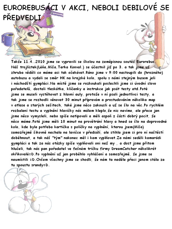 -> Zúčastnili jsme se soutěže v Eurorebusu, kde jsme samozřejmě zjistili, jací jsme debilové =D.. Ale hezké 14. místo =)