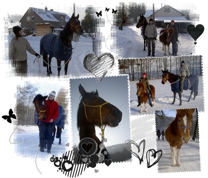 Dopolko jsme se vydali do Bělovse... Holky už na nás čekali, rychle (snažili jsme se ) jsme se převlékli a šli pomoct holkám krmit kravičky :)... Pak jsme se šli nasnídat ( i když už jsme snídali, ale dvě snídaně to není na škodu, že?? ) a pak jsme šli pro koníky... Míša si vzala Sallču, Lenka Zuzanku, Marťa Sárku a šlo se na věc, koníky jsme vyčistili, nasedlali, nauzdili a šli se sami připravit :). Lenka se Zuzankou a Marťa se Sárkou šli do terénu, Míša měla se Sallčou a Jančou trénink na jízdárně... Pak jsme vykydali ( hodně toho udělai Míša a Janča ), protože se Lenka s Marťou vrátili o trošku dýl :)... I tak jsme se ale o práci podělili :).. Pak nás holky ( teda spíš Jarda ) dopravil na nádraží a my jsme čekali na vlak.. Jenomže byla tam fakt skvělá prodavačka jízdenek, která tam něco vyřizovala a pak odešla a my jsme neměli ( a plno dalších lidí ) lístky a tak nám vlak ujel....Musel pro nás přijet pan Prouza... Odpolko jsme šli na to bílé prasátko ( tedy teď v zimě to celkem jde :) ) a šla se zase trošku projít a malinko proběhnout pod sedlem.. Nejdřív šla Miška, pak Lenča... Pak jsme kobču pustili a protože jsme ještě měli plno času, šli jsme sáňkovat :).... Párkrát jsme narazi do plotu a tak jsme rozhodli, že se půjdeme klouzat na led :D:D .... to bylo taky bezva :D.... Pár tlamiček nechybělo :D:D ... Byl to opravdu skvělý den!!!